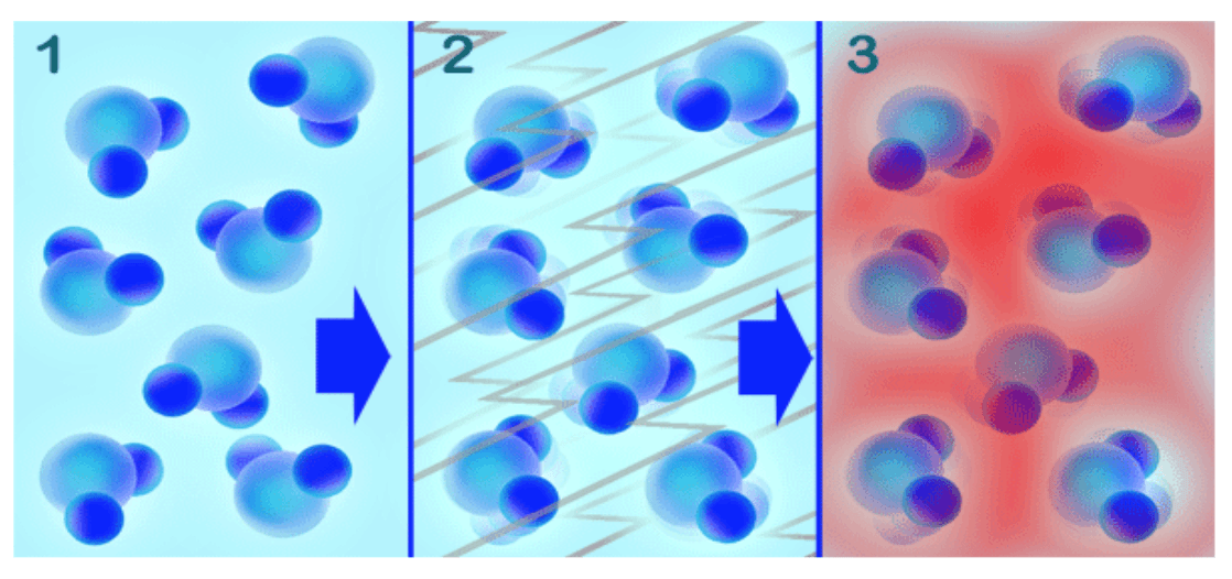 Figura esquemática del fenómeno de la transformación de la energía del campo eléctrico a energía cinética: 1) las moléculas de agua atrapada en la malla cerámica ADR, 2) moléculas de agua en movimiento excitadas por un campo electromagnético, 3) el movimiento de las partículas provoca la generación de fricción y por ende calor. La tecnología de ADR se encuentra protegida por la patente P 387274.